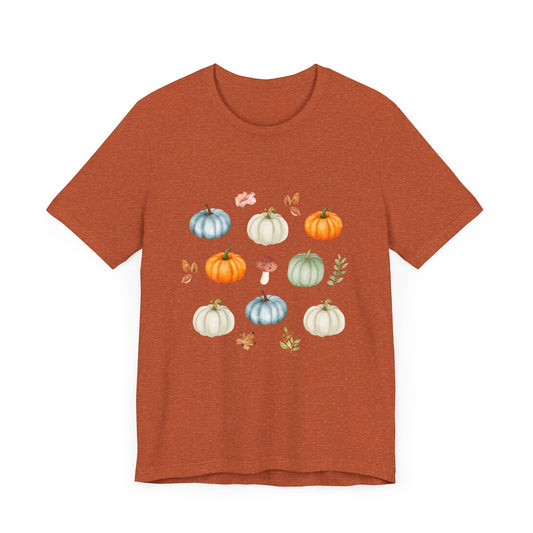 Cozy Pumpkin Coffee Mushroom T-shirt - Rustic Autumn Farmhouse Unisex Jersey Short Sleeve Tee